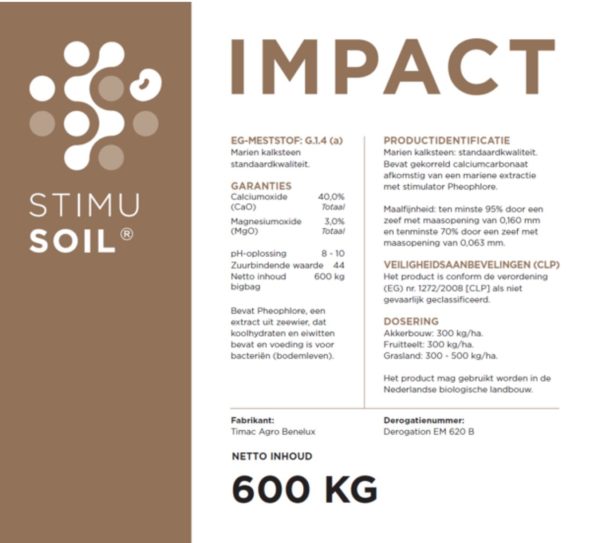 Een geschikt product voor het uitvoeren van een calciumbemesting is Stimusoil Impact. Dit is een product dat naast calciumcarbonaat ook sporenelementen en suikers bevat. Deze suikers zijn geschikt als voeding voor het bodemleven en stimuleren zo de bodemgezondheid van het perceel. Daarnaast worden in de bodem aanwezige bacteriën door middel van de suikers in Stimusoil Impact gevoed. Deze zorgen voor een goede afbraak en omzetting van organische stof in de bodem. Zeker op percelen waar organische stof wordt aangevoerd zal Stimusoil Impact een plus geven in het verbeteren van het bodemleven. Stimusoil Impact is daarom een investering in de bodem voor de langere termijn. Daarnaast zorgt de aanwezige calcium voor structuurverbetering en komt het op korte termijn beschikbaar voor de boom.