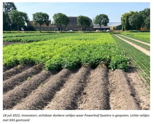 Starten vanaf dat de stolonen zich gaan verdikken (erwtjes of knikkertjesstadium): 50 ltr/ha. Dit twee keer om 10 – 14 dagen herhalen. Een optie is om laatste 2 toepassingen wekelijks met 25 ltr/ha toe te passen zolang er loofgroei is. Wanneer Powerleaf Quattro op deze manier wordt toegepast kan 150 ltr/ha 200 kg KAS 27 % prima vervangen met in veel gevallen een hogere opbrengst en minder stikstof.