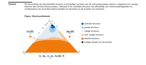 In bovengenoemde driehoek draait het om de verhouding in de bezetting van calcium, magnesium, kali, natrium, waterstof, aluminium en ijzer. In de gekleurde driehoek ziet u een blauw bolletje. Dat geeft de structuursituatie van uw perceel aan. Afhankelijk van de positie krijgt u onder de driehoek een advies voor calcium en of magnesium in kg/ha. Deze gift is nodig om het blauwe bolletje in de positie van de optimale structuurcirkel te krijgen.