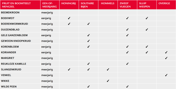 Een mooie manier voor het aantrekken van nuttige insecten is het inzaaien van een bloemenstrook. Hiervoor hebben wij, in overleg met onze leverancier, een mengsel samengesteld, het Fruitmax Bloemenmengsel. Dit mengsel bevat 14 verschillende bloemen- en kruidensoorten, elk met een specifieke aantrekkingskracht voor nuttige insecten. Het is een meerjarig mengsel, wat specifiek ontwikkeld is voor toepassing in de fruitteelt in de grasbanen. De tabel hieronder geeft een overzicht.