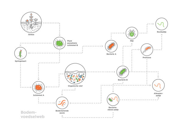 Figuur 1: Het bodemvoedselweb: een goede balans tussen de verschillende soorten bodemleven is belangrijk voor een gezonde bodem