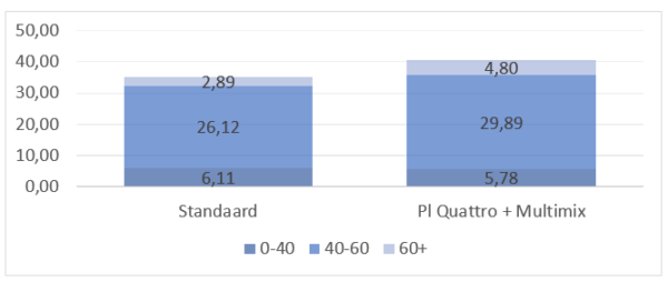 Toevoeging van 2,50 ltr/ha Stimuplant Multimix aan 10-15 ltr/ha Powerleaf Quattro, geeft een sterkere plant en meeropbrengst. (zie figuur mbt opbrengst in ton/ha)