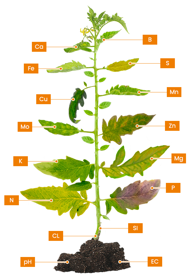 Voor een gezond gewas is de juiste voeding essentieel. Alle elementen zijn onmisbaar en dienen in precies de juiste hoeveelheid aanwezig te zijn. Het is daarom belangrijk dat u gebreksverschijnselen signaleert zodat u tijdig kunt bijsturen. Hoe u het beste kunt bijsturen, hangt af van meerdere factoren. Klik op een symptoom in de afbeelding hieronder voor meer informatie over gebreksverschijnselen en hoe u deze kunt herkennen. Onze  bemestingsspecialisten voorzien u graag van een passend advies.