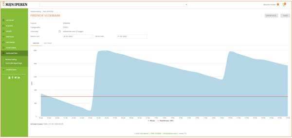 Als u vloeibare meststoffen van Van Iperen gebruikt, ziet u de optie niveaumeting in het menu. Met één druk op de knop krijgt u een overzicht van de niveaus van uw vloeibare meststoffen. U kunt een gewenst minimaal niveau per tank instellen en zodra de voorraad onder dat niveau komt, wordt er automatisch een order in ons systeem aangemaakt en komen wij uw tanks bijvullen.